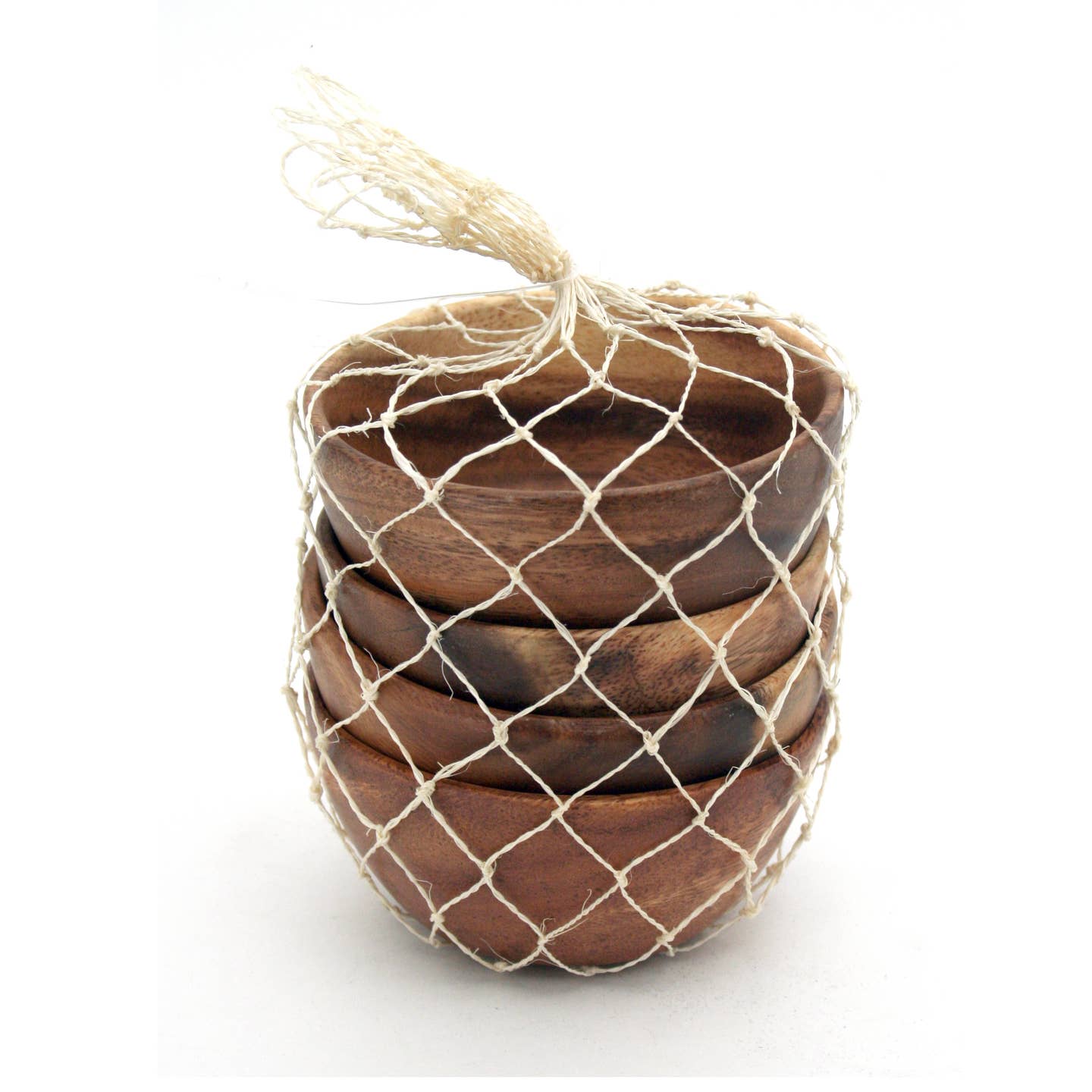 Acacia 4" Round Server Bowl Set of 4 Netted Bag. Each bowl measures 4X4X2" H. Food-safe. Ideal as a dipping bowls, or catch all for jewelry. Use as decor or gifted for a special occasion.
