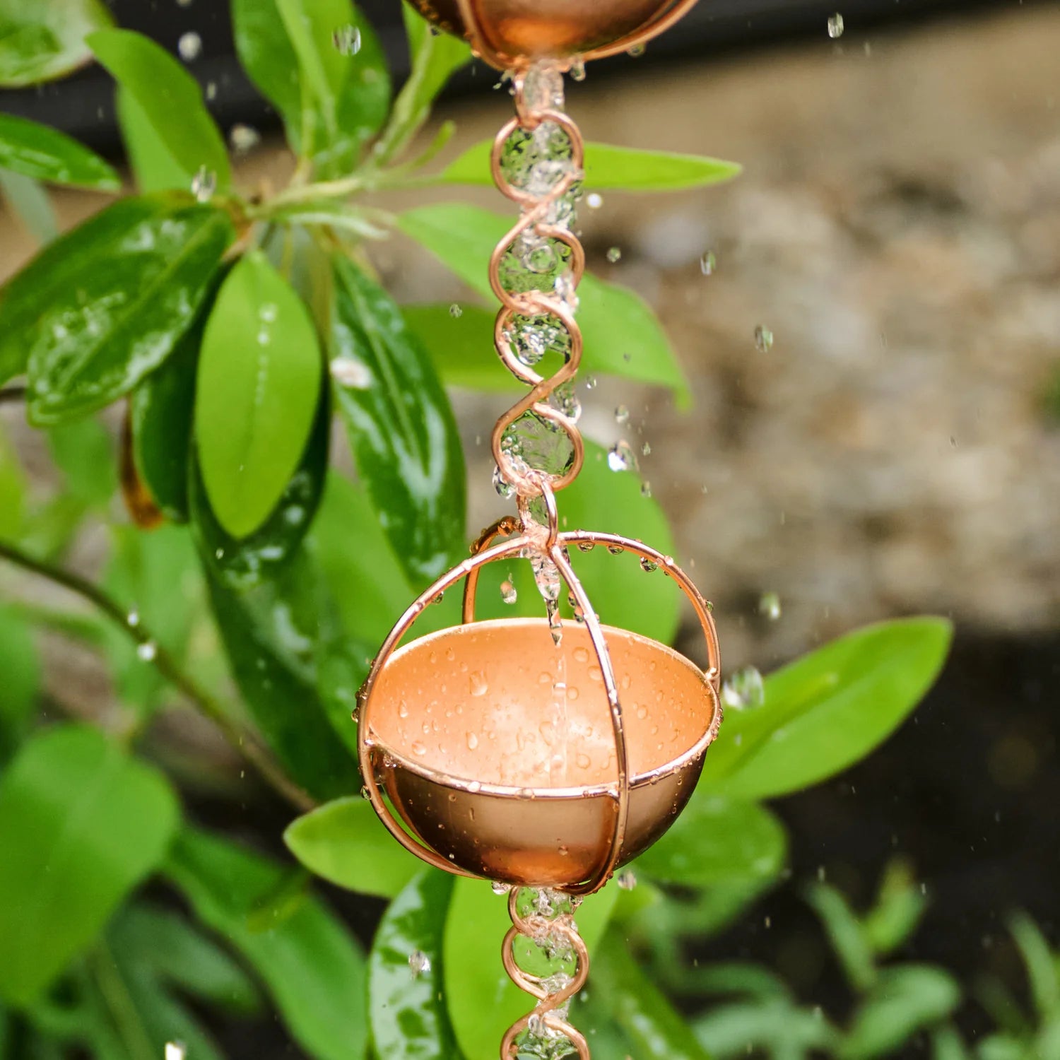 Introducing the 7' Prava Copper Rain Chain! Say goodbye to boring rain spouts. Eleven round iron cups, each surrounded by intersecting circles, make rainwater flow in a unique and beautiful way. Attach easily to your rain spout for a fun twist on traditional downspouts. Enjoy the calming sound and fascinating sight of rain cascading from your gutter to your garden.